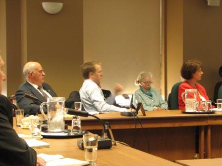 Garry Breitkreuz, Chris Warkentin and Joyce Murray (left to right, seated at table) were among the Members of Parliament present to listen to the presentation