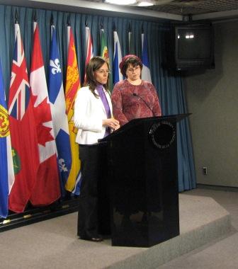 Rebecca Walberg and Andrea Mrozek, co-authors of the report, address reporters at the press conference on Parliament Hill